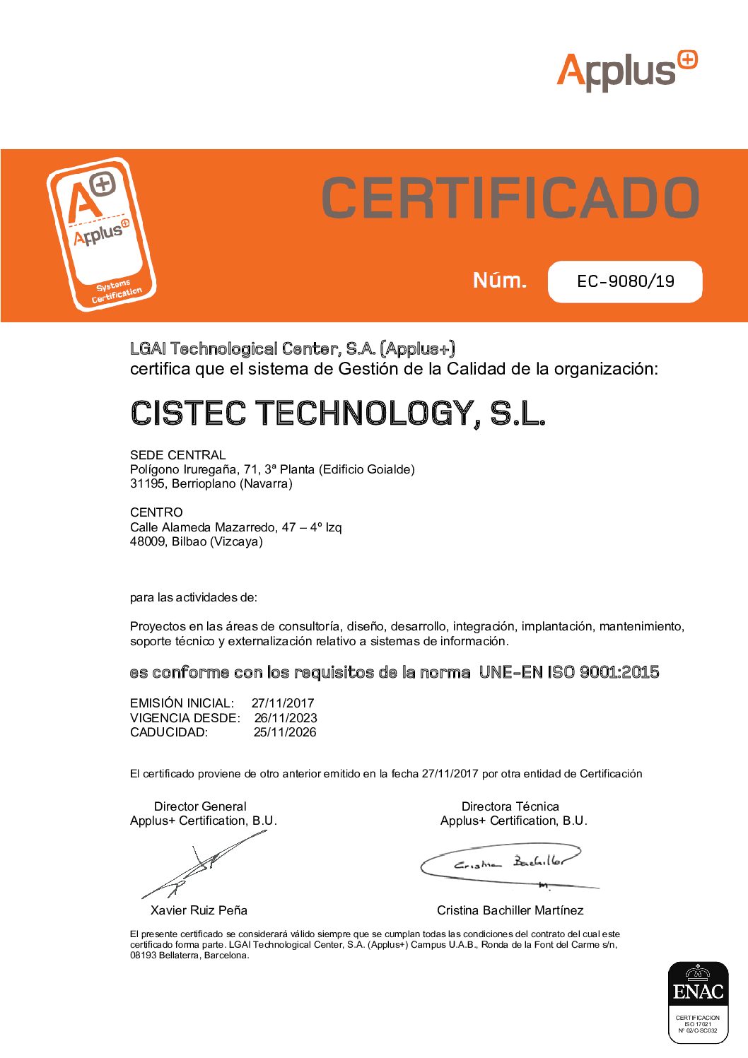 El objetivo prioritario de CISTEC Technology, es aportar a nuestros clientes soluciones tecnológicas en sistemas de información que cumplan con sus expectativas y se adapten a sus necesidades con el mayor nivel de calidad posible. Bajo el marco de la norma UNE-EN ISO 9001:2015 nuestros principios de la política de calidad son los siguientes: